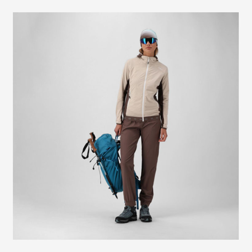 - Tkanina nudi zaščito pred vetrom, raztegljivost in udobje, zato je idealna za dinamične aktivnosti na prostem.